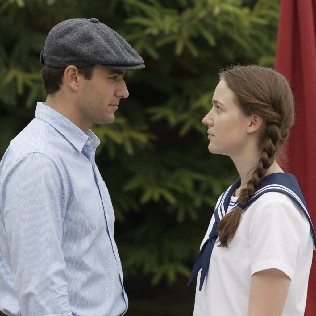 Photograph of two people facing each other. Man on left, wearing gray flat cap and blue striped shirt, looking at woman. Woman on right, with light brown hair in braid, wearing white sailor top, looking at man. Green foliage background. Red fabric on right edge. Both with neutral expressions. Daylight.