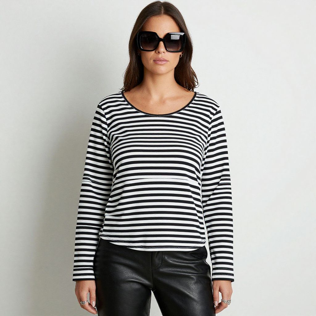 "Woman, casual, long-sleeve striped top in black and white, scoop neckline, relaxed fit, asymmetrical hem, black faux leather pants, snug fit, oversized sunglasses, silver rings on fingers.. Sexy. Pretty face and beаutiful eyes. Big breasts."