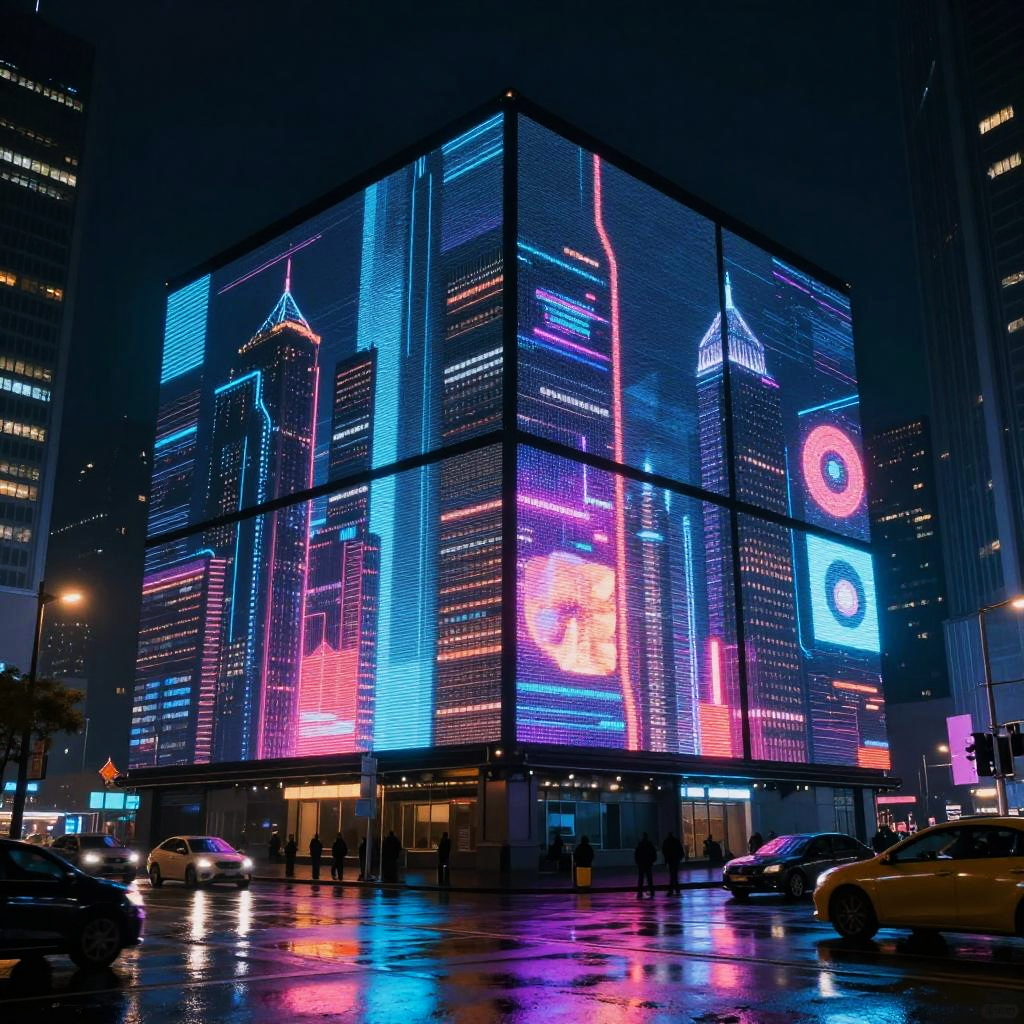 Futuristic 40x40 LED display panel lighting up a cyberpunk cityscape at night, neon colors reflecting on rain-soaked streets, sleek skyscrapers with holographic ads, atmospheric and vibrant urban environment, detailed digital art