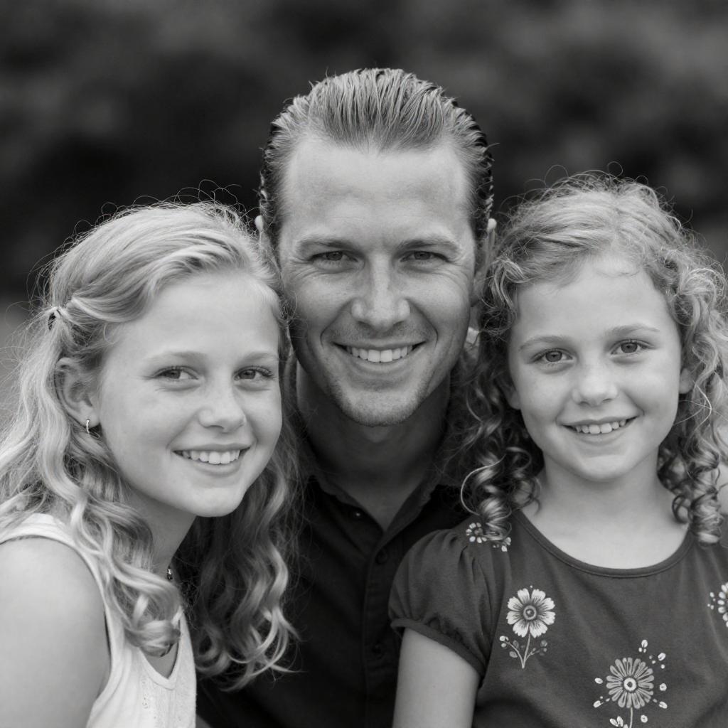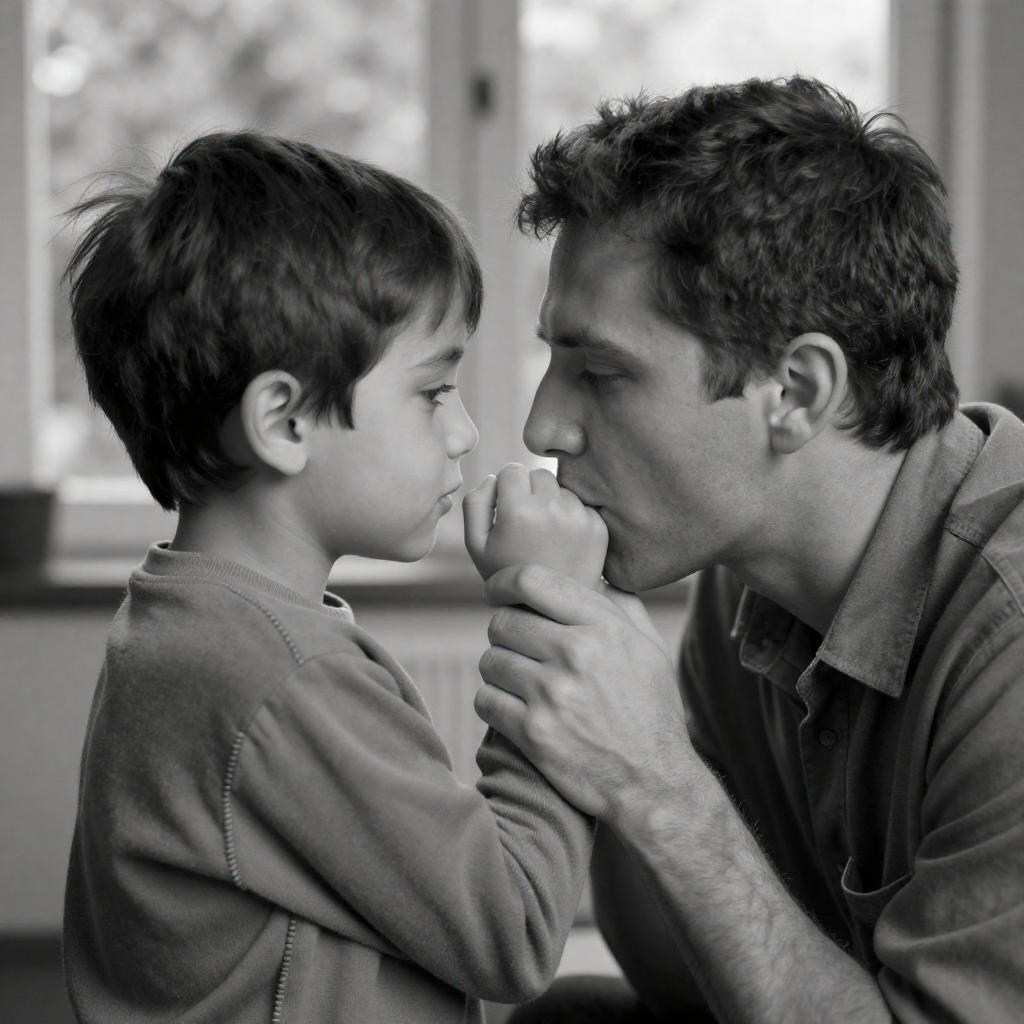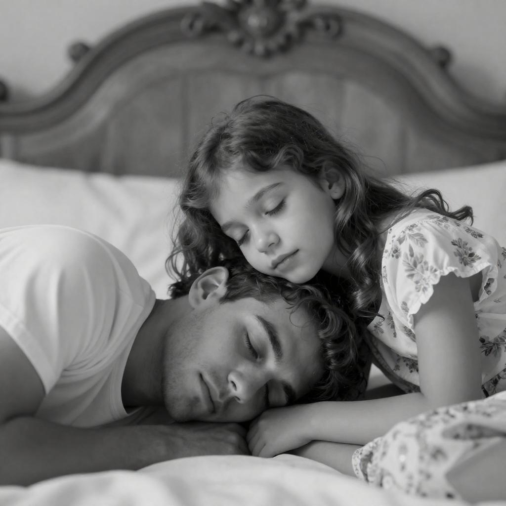 Black and white photograph of a man and a young girl. Man with slicked-back hair, light suit, and pocket watch, kisses girl's cheek. Girl with braided hair, floral dress, and ribbon, smiles. Both lean against tree with leaves. Man's left arm around girl's back. Soft sunlight filters through leaves. Background of blurred trees.