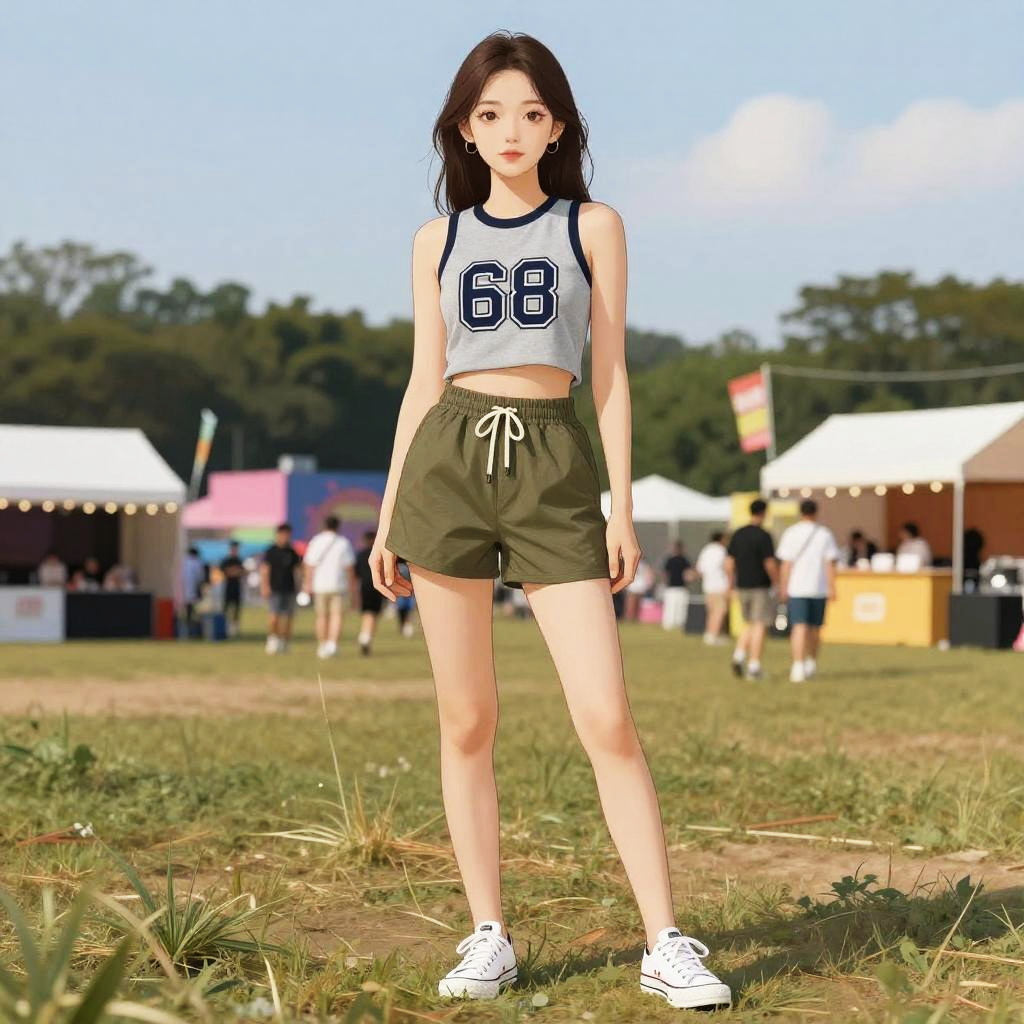 A petite woman in a casual sporty outfit featuring a grey sleeveless cropped tank top with a 68 graphic and olive green drawstring shorts, paired with white low-top sneakers, stands at a vibrant music festival in a small village, illustrated in a Shogakukan style. Sexy. Pretty face and beutiful eyes