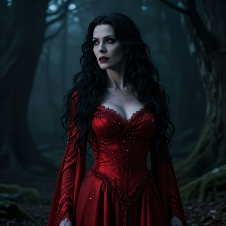 Photograph of a pale-skinned woman with long, wavy black hair standing in a dark, misty forest. She wears a form-fitting, red satin gown with a low neckline adorned with tiny sparkling beads, accentuating her ample cleavage. Her makeup is dramatic, with dark red lipstick and dark eyeshadow. The forest background is shadowy, with tall, indistinct trees and a blue-tinted light filtering through the fog. The overall mood is mysterious and eerie, with a Gothic aesthetic. The woman's serious expression and the dark setting evoke a sense of fantasy or supernatural theme.