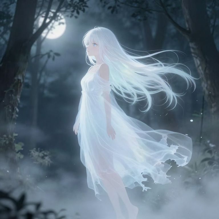 Digital anime-style artwork depicting a translucent, ethereal woman with long, flowing white hair illuminated by a glowing moonlight in a dark, misty forest. She wears a sheer, white, flowing dress that trails behind her. Her pale skin and delicate features are softly outlined, creating a ghostly appearance. The background consists of dark, shadowy trees and a foggy atmosphere, enhancing the mystical, otherworldly feel. The moonlight casts a bluish-white glow, highlighting her figure and hair. Small, glowing particles float around her, adding to the magical ambiance. The overall composition is serene and hauntingly beautiful.