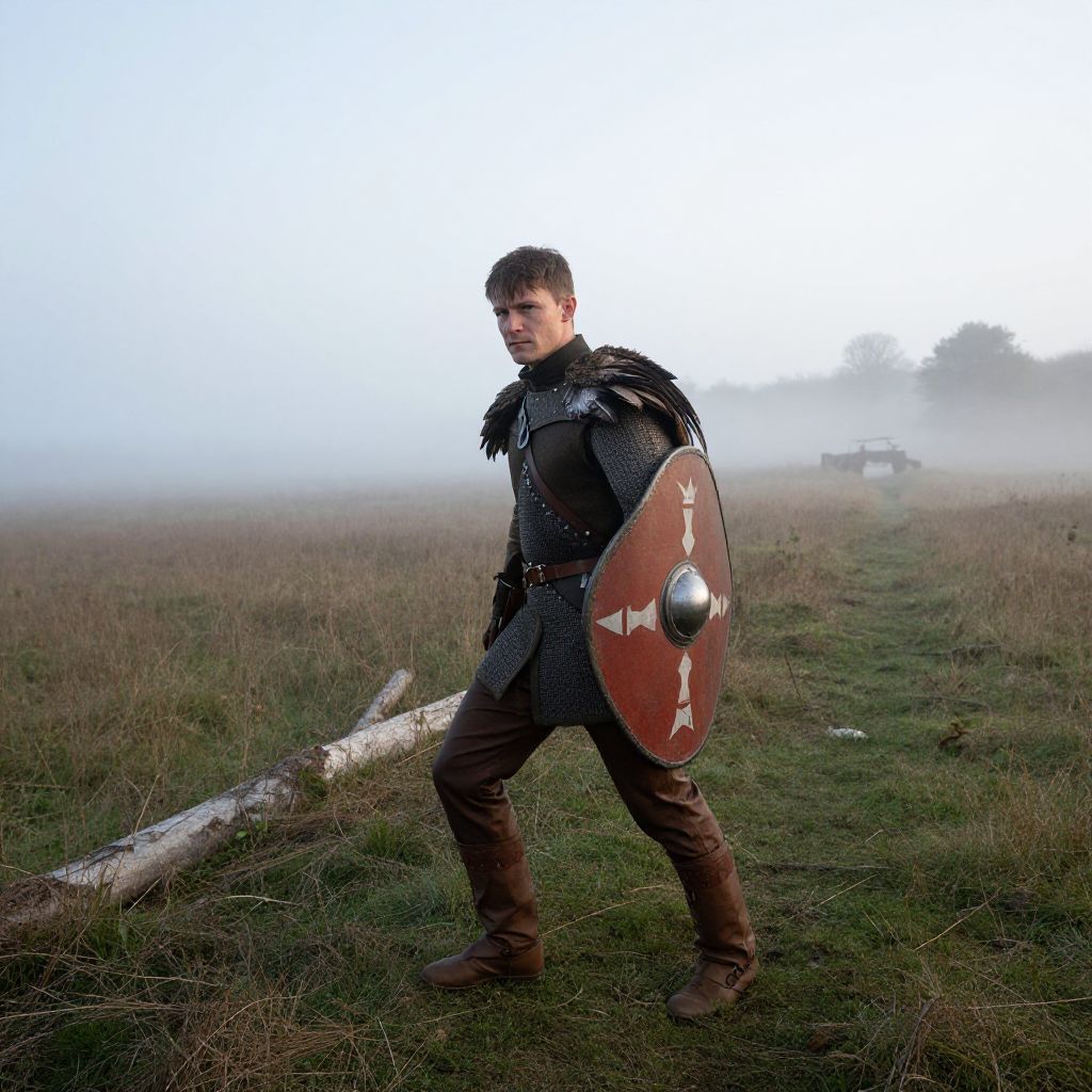 Photograph of a young Caucasian man with short brown hair, standing in a misty, grassy field. He wears medieval armor, including a black fur-lined tunic, leather pants, and brown boots. He holds a large, round wooden shield with a silver boss in his left hand, and a sword in his right. A fallen log lies on the ground to his left. In the background, a faintly visible, distant vehicle is partially obscured by fog. The sky is overcast, and the ground is covered in tall grass. The man's expression is determined, and he stands in a ready stance.