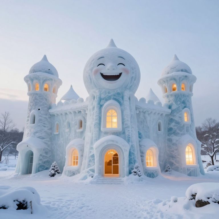 An ethereal fortress of frozen laughter stands serenely amidst a snow-blanketed landscape, its organic forms and glowing interiors inviting introspection and warmth, while the crisp air whispers tales of transience and the enduring spirit of joy.