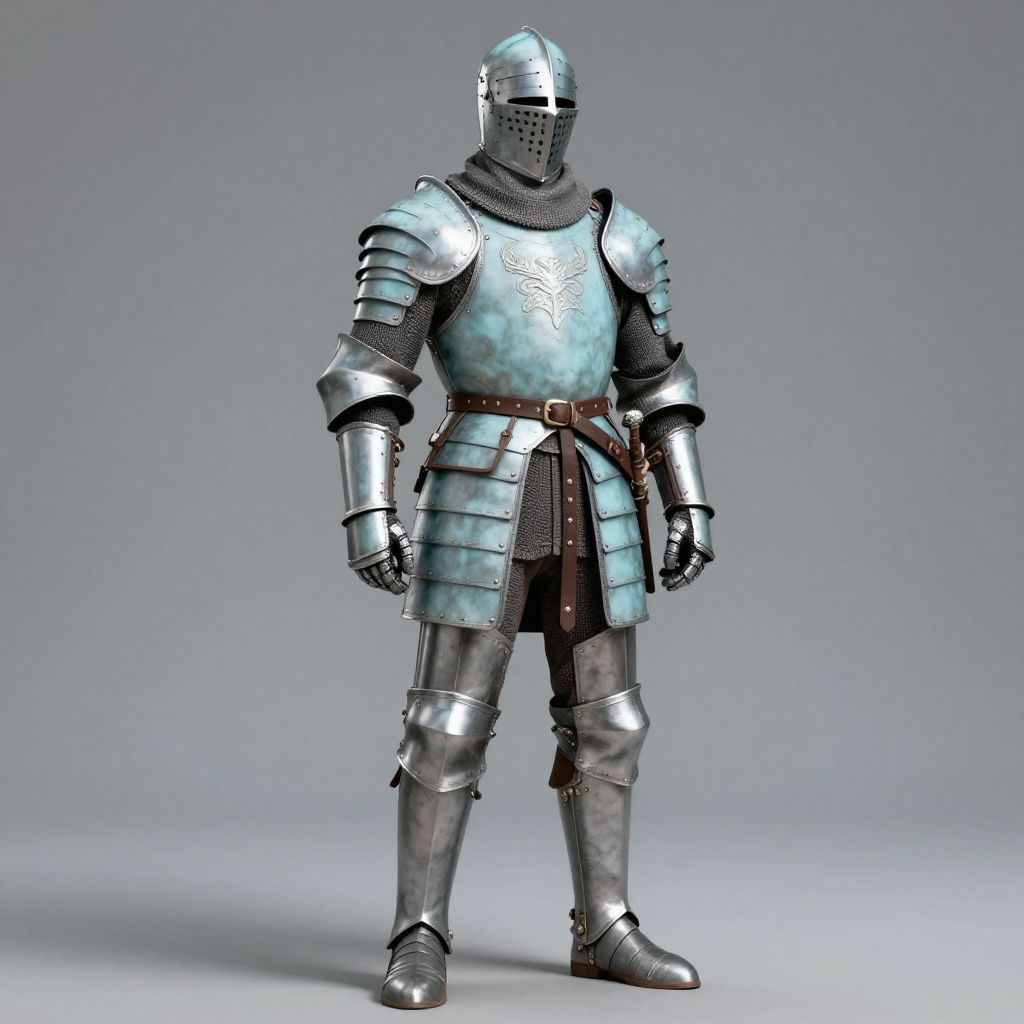 Hyper-realistic, Realism, HDR, detailed, medieval warior style, pale-cyan leather, armor with pants with boots, simple gray background