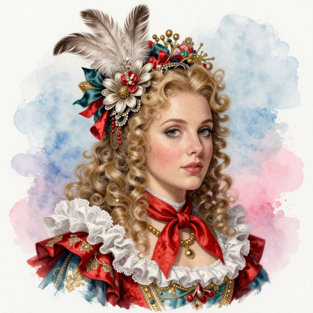A vintage-inspired embroidered pendant featuring a Rococo-style portrait of a woman with vibrant orange hair, set in an ornate gold frame, adorned with delicate floral accents and crafted with meticulous hand embroidery, evoking a timeless and artisanal aesthetic.