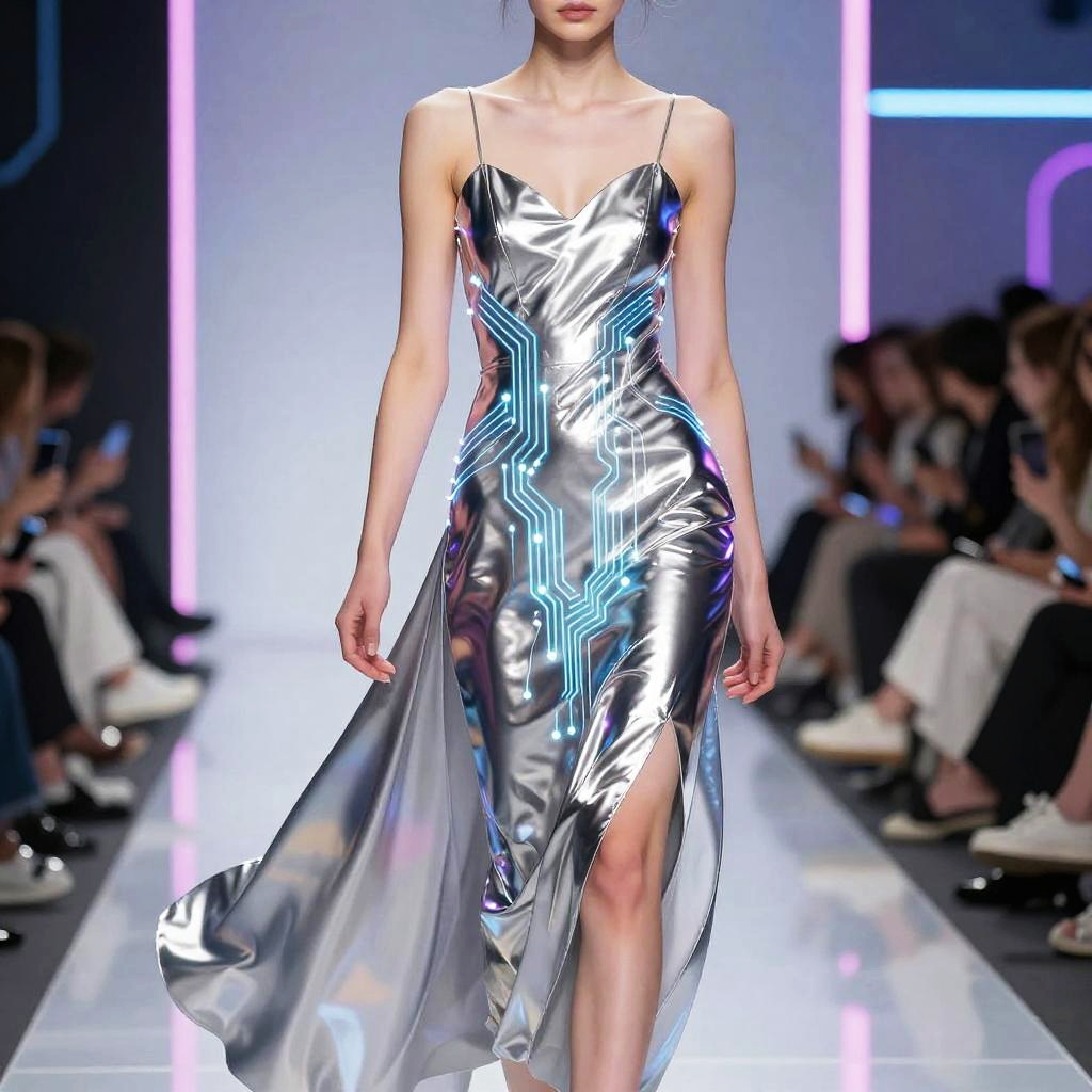 AI outfit generator free visualization of futuristic mannequins showcasing AI-created ensembles on a futuristic runway, digital patterns swirling around, pastel lighting, sleek fabrics, cutting-edge fashion innovation theme, augmented reality effects