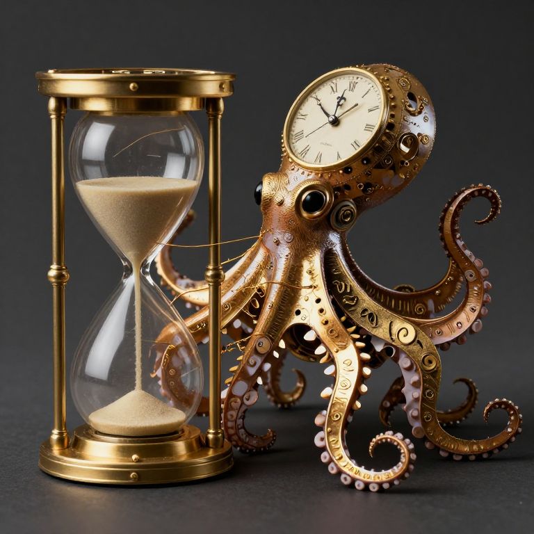 A clockwork octopus weaves time itself into golden threads, crafting hourglasses that depict alternative realities.