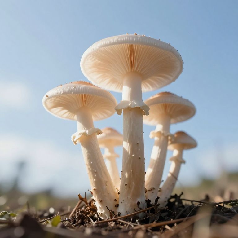 Emerging from the earth like whispers of possibility, these ethereal fungi stand tall under a boundless sky, their delicate forms bathed in sunlight that feels both ephemeral and eternal, evoking a sense of wonder and the quiet promise of renewal.