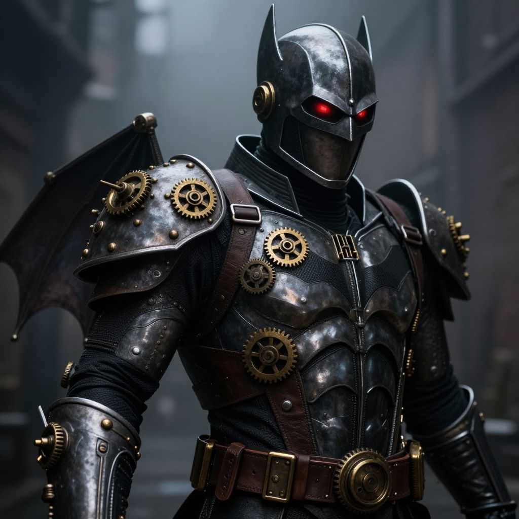 Close-up of a metal bat costume with detailed steampunk aesthetic, brass gears and rivets decorating the bat wings, leather straps and helmets with glowing red eyes, foggy dark alley setting, intricate textures highlighting the metallic surfaces.
