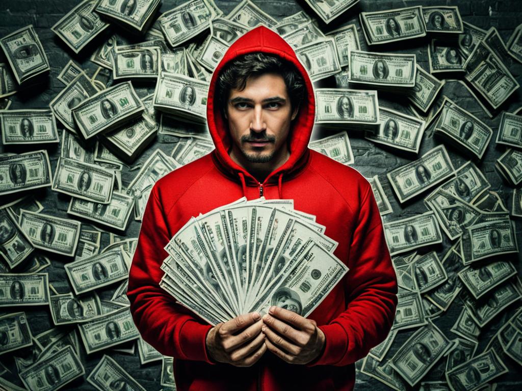 Gum Chewing Ticket Winner Woman, woman with red hair and a fake money sticking out of her mouth