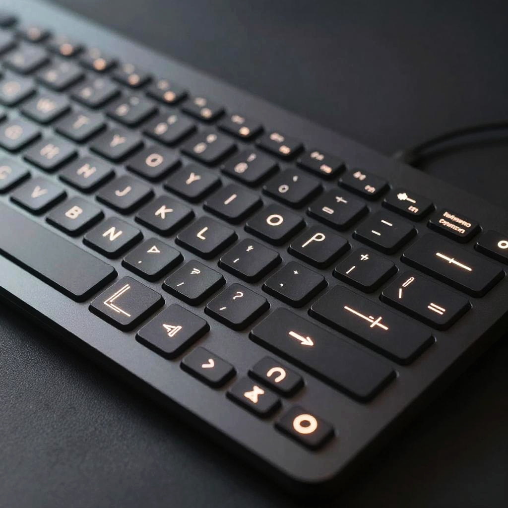 Close-up of a hyperboard keyboard with illuminated keys and programmable touchpads, futuristic typography, complex symbols glowing softly, minimalist high-tech environment