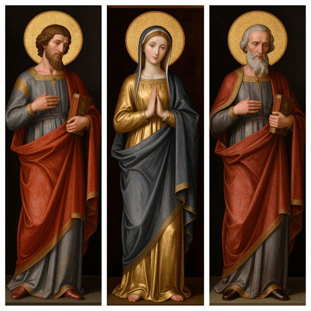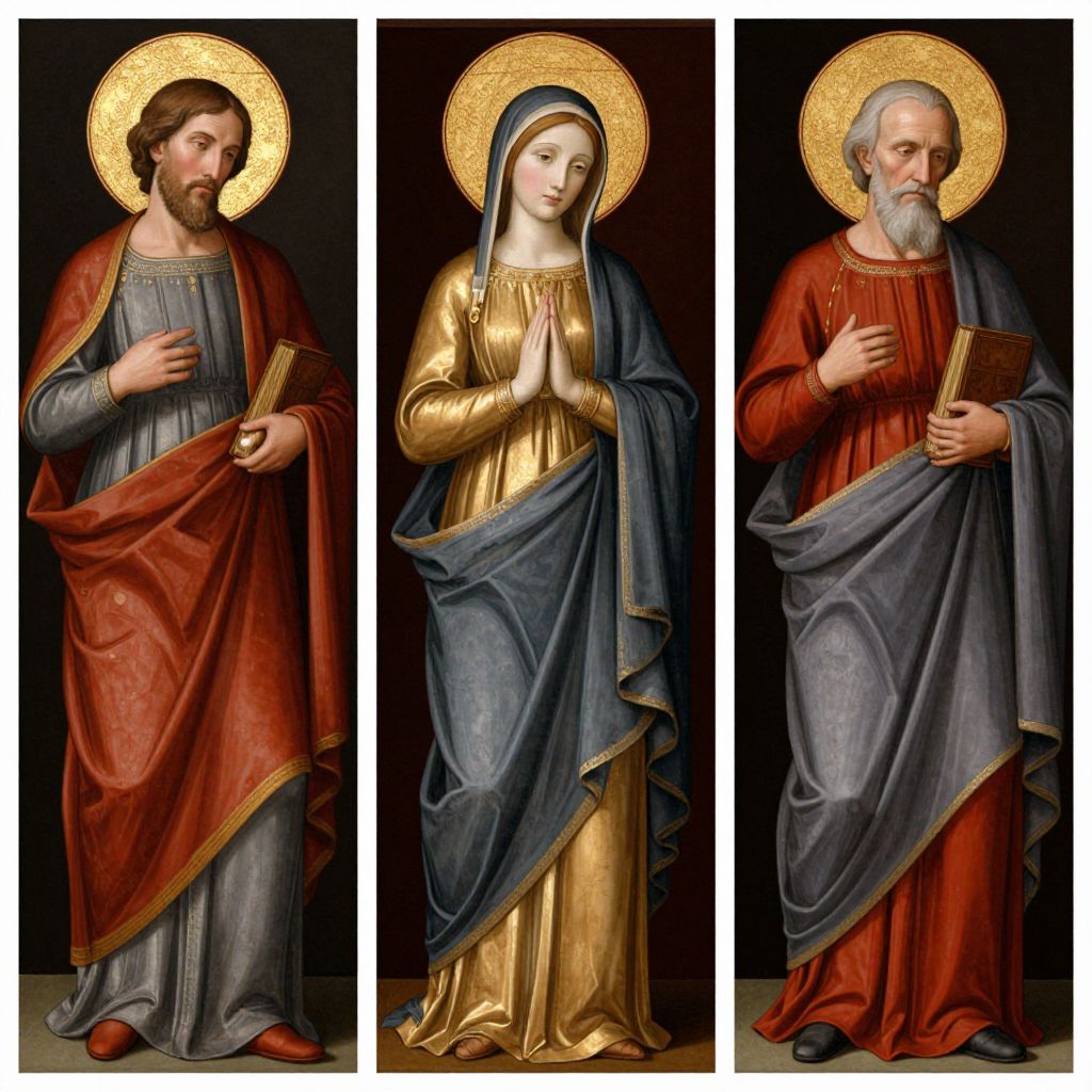 Triptych depicting three saints: a bearded man in red and blue robes holding a book, a woman in gold and blue attire with hands clasped in prayer, and an elderly figure in red and blue garments also holding a book, all set against dark backgrounds with golden halos above their heads.