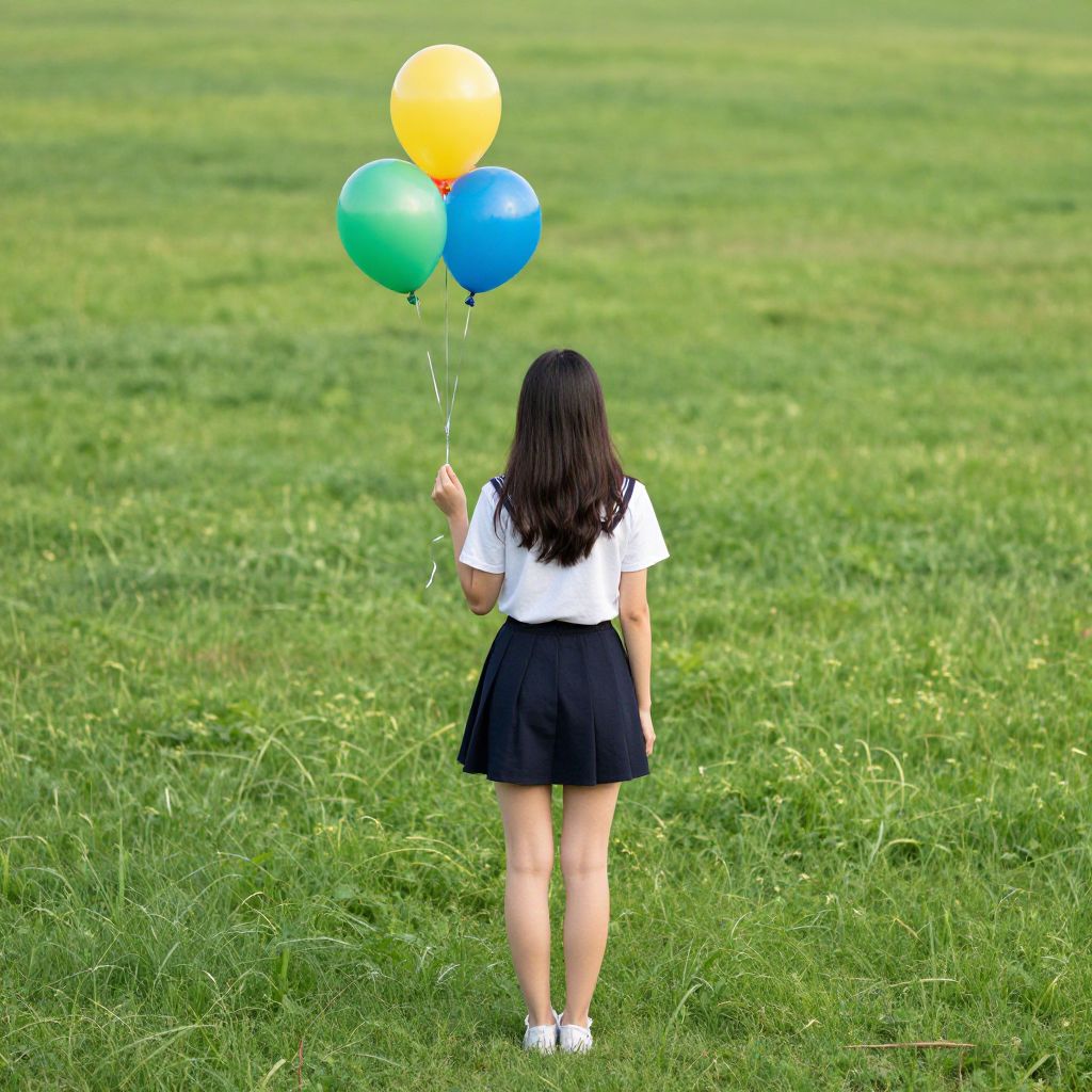 Photograph of a young girl with long dark hair, standing in a vast, green grassy field. She faces away from the camera, holding three colorful balloons—yellow, blue, and green—tied with white strings in her right hand. She wears a white short-sleeved shirt, a black knee-length skirt, and white sneakers. The field is lush and expansive, with a slightly blurred background, emphasizing the girl and balloons as the focal point. The bright colors of the balloons contrast with the green grass, creating a cheerful and playful atmosphere.