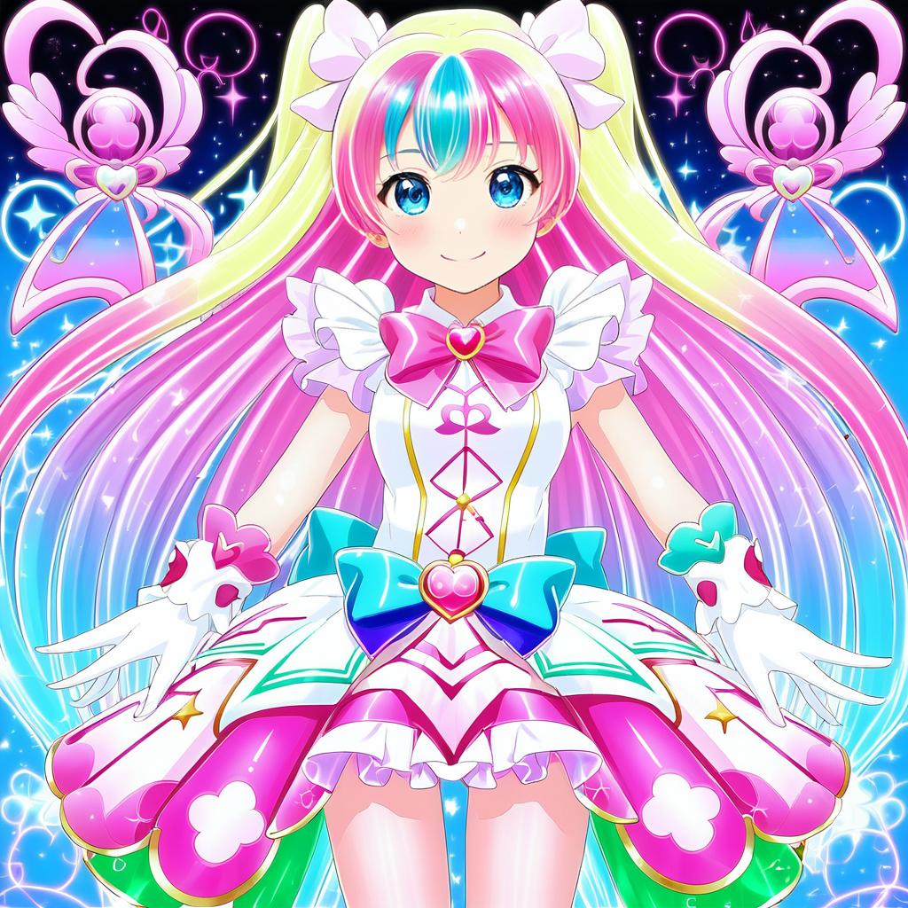 Digital illustration of a vibrant anime-style magical girl character with long, two-tone hair featuring pink and blonde shades with a blue streak. She has blue eyes and wears a detailed, colorful outfit consisting of a white dress with pink and turquoise accents, a large waist bow, a pink bow at the collar, and white gloves. The background is a sparkling, starry gradient with magical symbols and glowing elements, enhancing the magical girl theme.