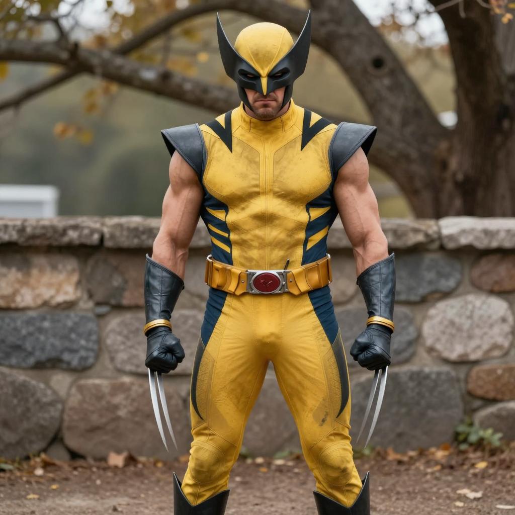 Wolverine costume adult, photograph of muscular man in yellow and black superhero costume, standing outdoors, daytime, tree branches in background, stone wall behind, armored helmet with pointed ears, clenched fists, sharp claws, abs and biceps visible, determined expression, superhero belt with circular emblem, realistic ure, comic book style, front view, full body, medium shot, natural light, autumn season, dirt ground