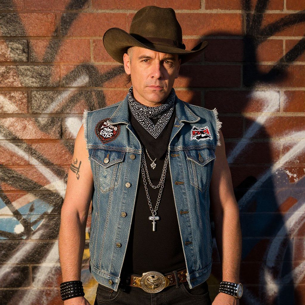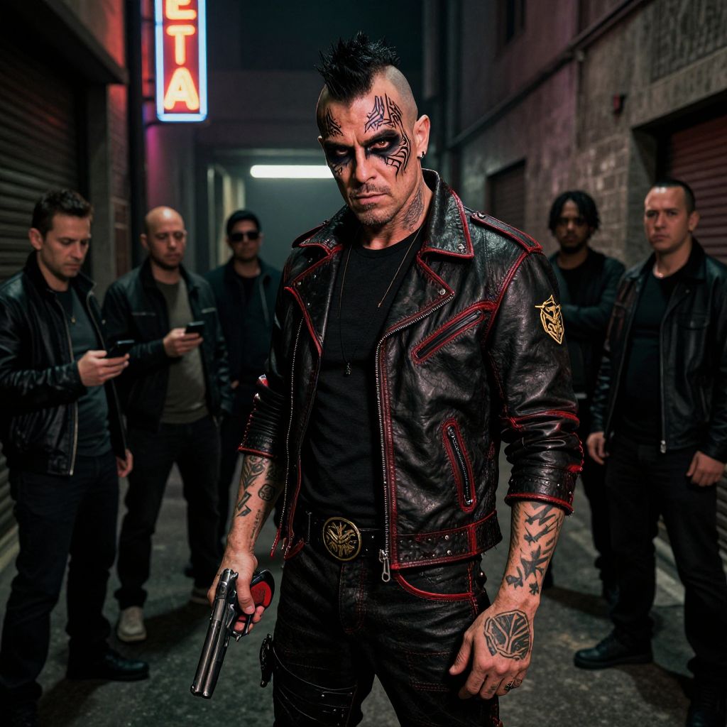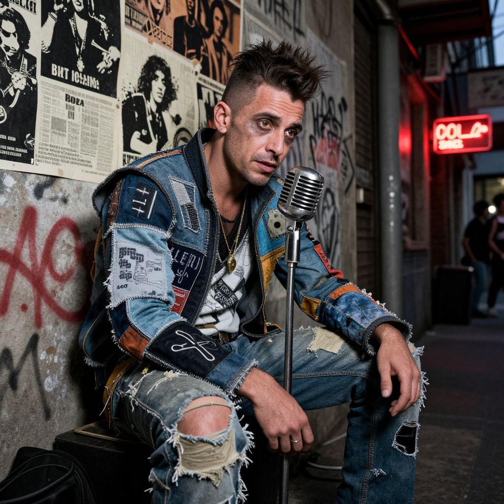 A gritty, authentic photo of a street performer wearing a roadman-style hairstyle and a homemade rock costume made of patches and torn fabric, sitting on a graffiti-covered wall in a urban alley, with a vintage microphone in hand, his face is weathered, with deep-set eyes and a tired yet spirited look, the background includes posters of rock legends and a red neon sign flashing