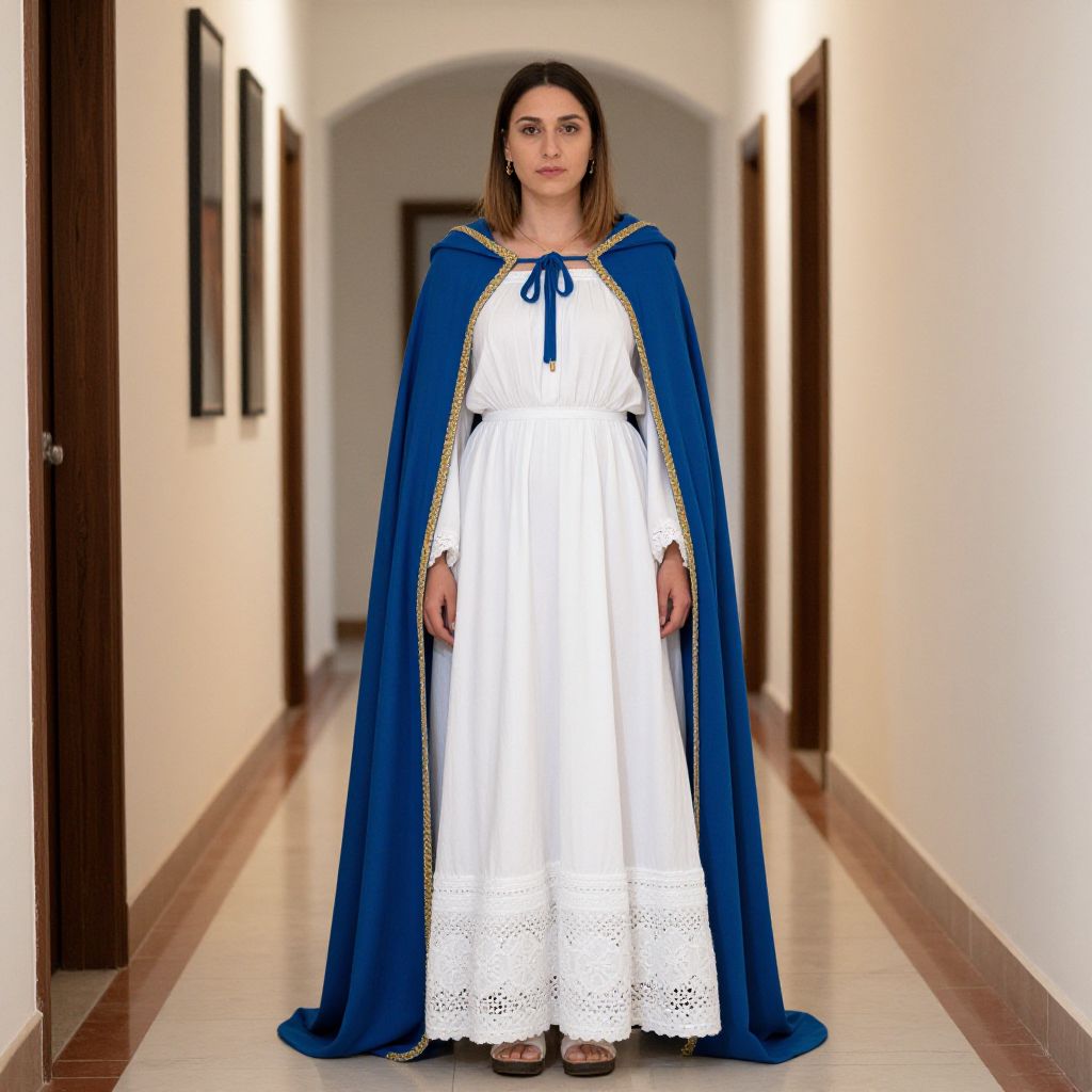 Photograph of a young woman with light brown skin and straight, shoulder-length brown hair standing in a brightly lit, narrow hallway. She wears a white, long-sleeved, lace-trimmed dress with a blue cape that has gold trim and a blue ribbon at the neckline. Her expression is neutral, and she looks directly at the camera. The hallway has white walls, brown doors, and a tiled floor with a reddish-brown border. Two framed pictures hang on the left wall. The lighting is even, highlighting the woman and the hallway.