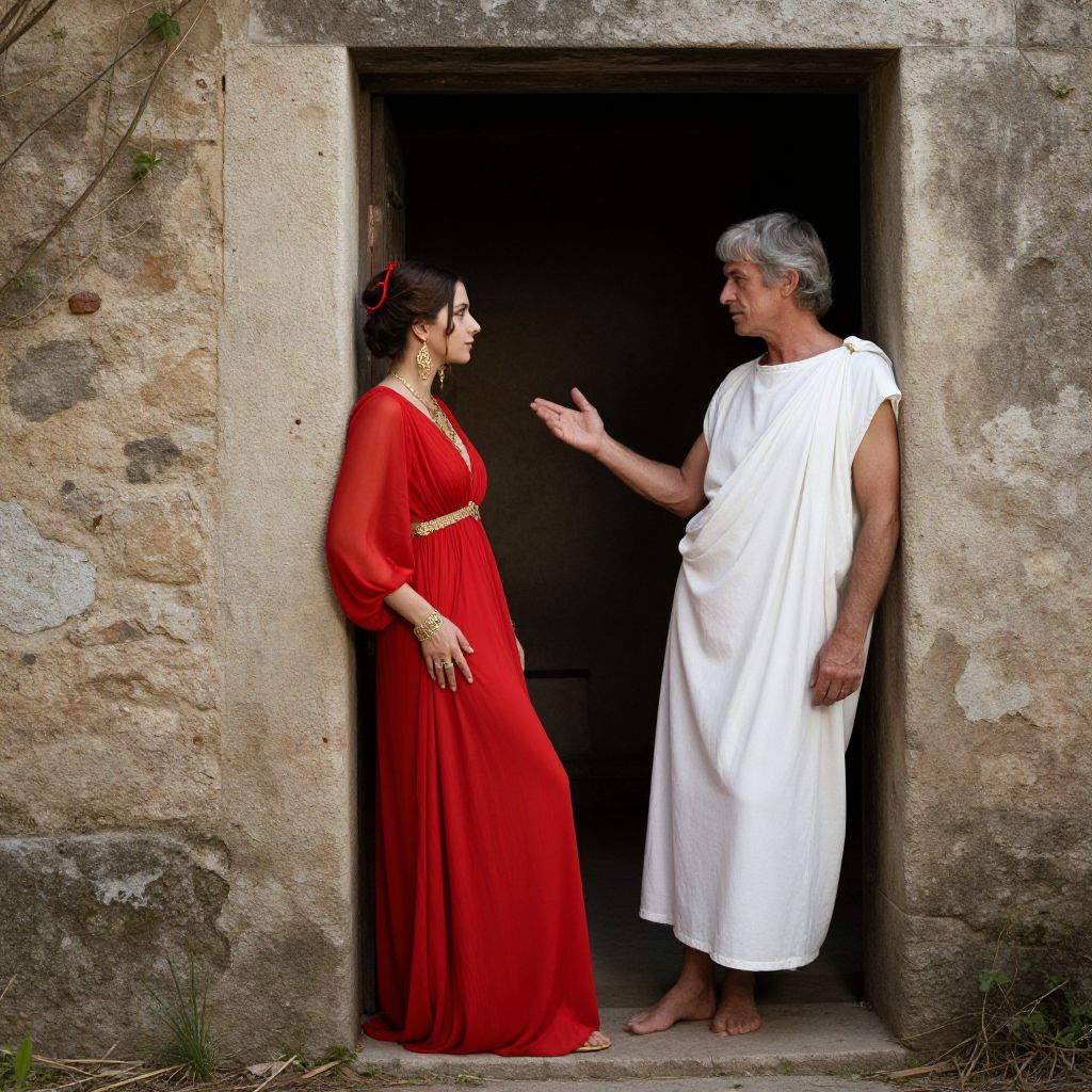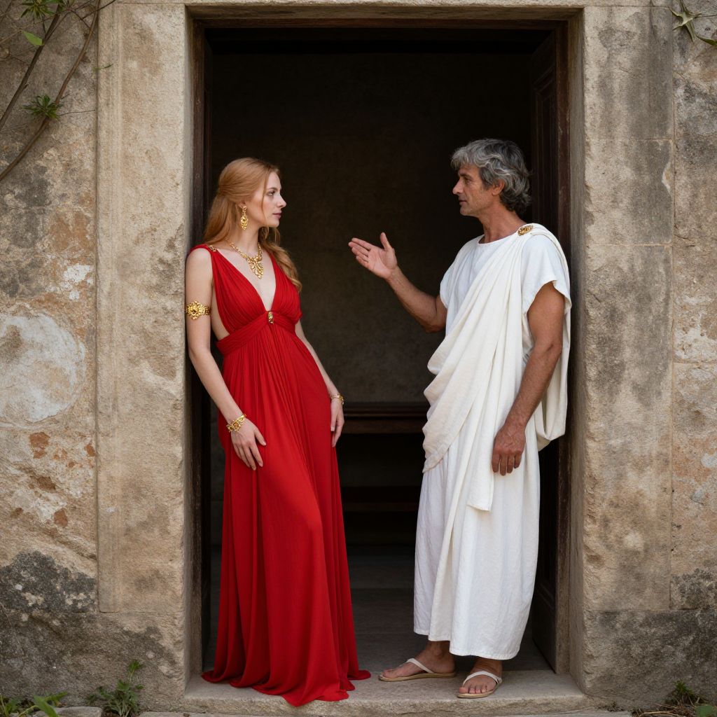 Two figures stand in a classical setting, with a woman in a flowing red dress adorned with gold jewelry leaning against a weathered stone wall while a man in a draped white garment gestures toward her, framed by an open doorway and flanked by sparse greenery.