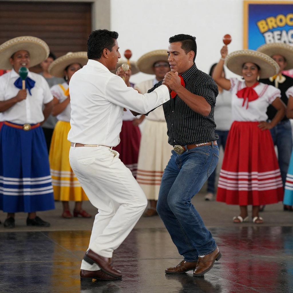 Photograph of a lively dance performance. Two male dancers, one in a white suit and the other in a black striped shirt and blue jeans, dance energetically in the center. Surrounding them are cheering spectators in colorful traditional Mexican attire, including sombreros and maracas. The ground is wet, reflecting the dancers' movements. A vibrant poster with Spanish is partially visible on the right.