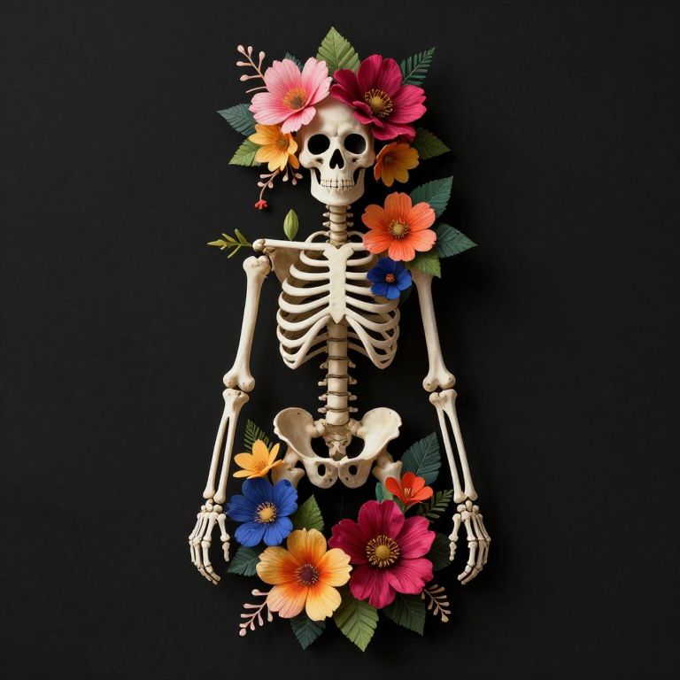 A skeletal figure adorned with vibrant flowers and leaves, set against a dark background.