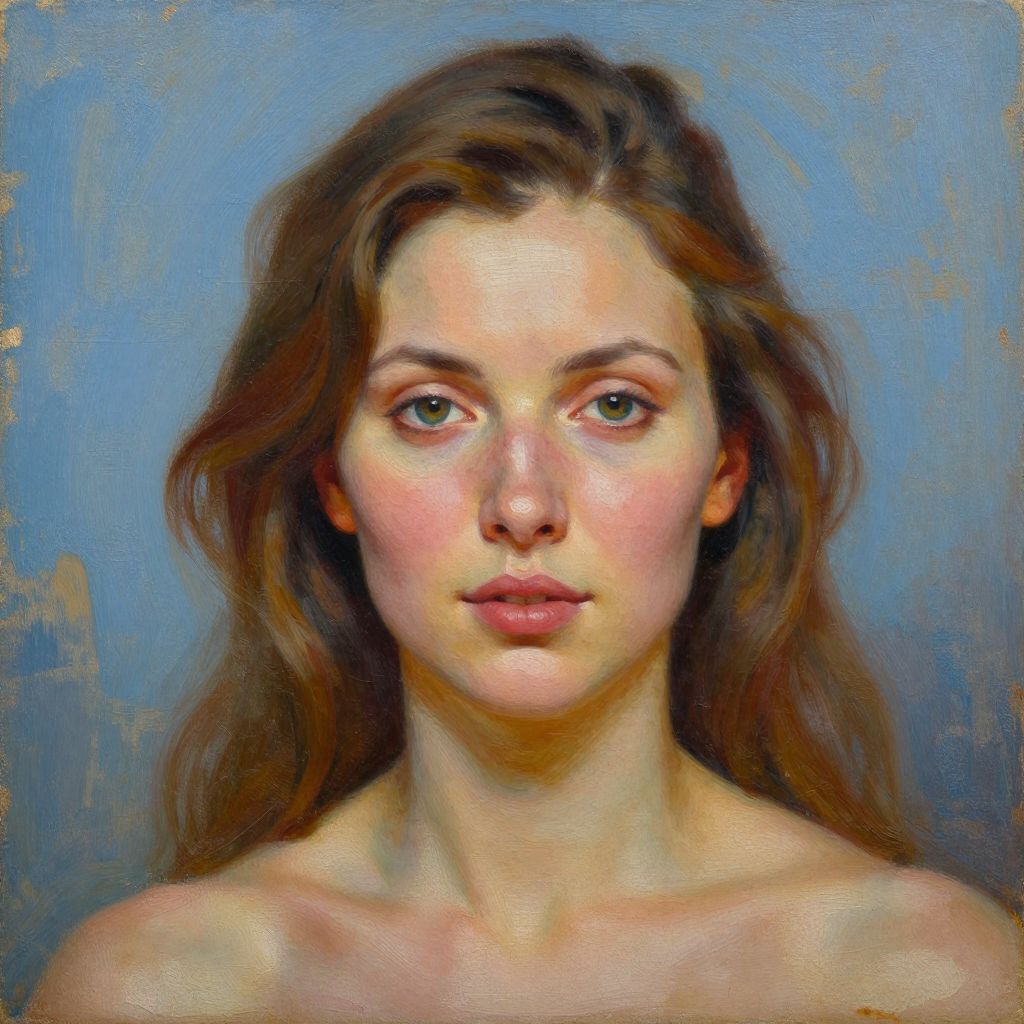 This is a digital painting of a young woman with fair skin and long, wavy brown hair. She has green eyes, a straight nose, and slightly parted pink lips. Her expression is neutral, with a slight hint of sadness. The background is a gradient of blue, transitioning from lighter at the top to darker at the bottom. The painting style is realistic with soft, blended brushstrokes, giving her skin a natural, slightly dewy texture. The woman is depicted from the shoulders up, with no visible clothing, and her shoulders are slightly turned to the left. The overall mood is serene and introspective.