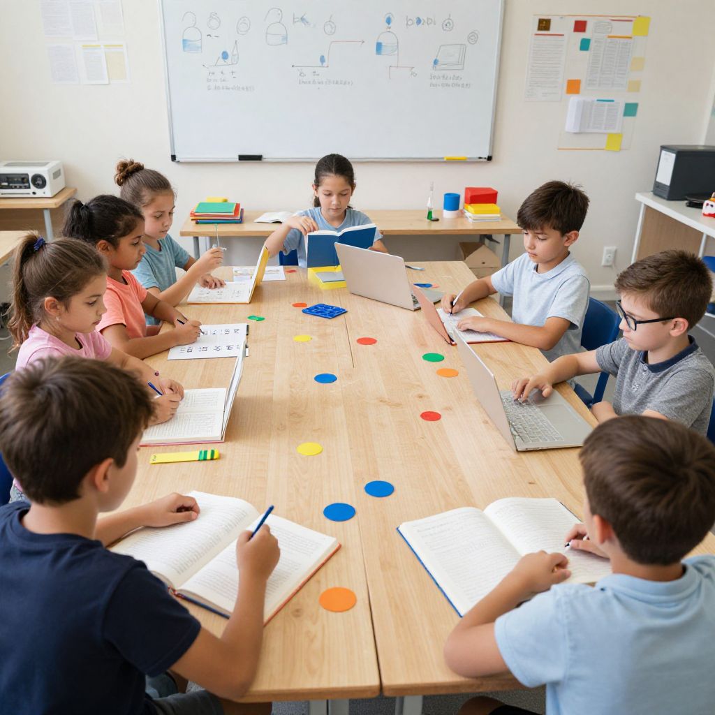 A dynamic educational setting where children are actively using a variety of learning tools—both traditional and modern—to explore subjects like math, science, and literacy in a playful, engaging way.