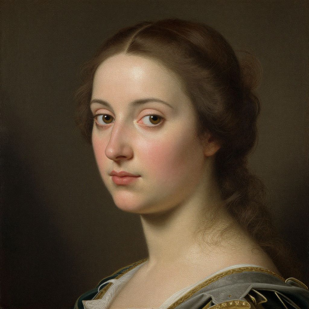 Photorealistic portrait of a young woman with fair skin, brown eyes, and brown hair in a braid, wearing a Renaissance-style gown. Dark