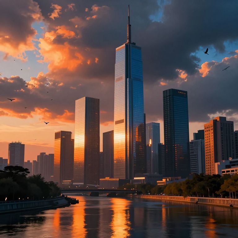 A cyberpunk-inspired digital artwork captures a futuristic cityscape at golden hour, with towering skyscrapers bathed in warm orange and blue hues, reflecting dramatically on a serene river below, as silhouettes of birds soar against a stormy sky filled with vibrant, impressionistic clouds.