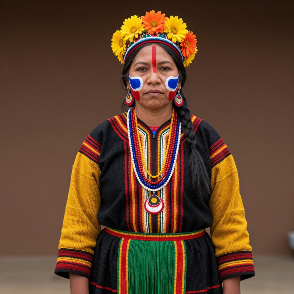 Banga folk dance, photograph of an indigenous woman, standing, frontal view, traditional tribal clothing, colorful patterns, yellow and orange flowers in hair, red and blue facial paint, multiple necklaces, black dress with red and yellow stripes, yellow sleeves, green skirt, detailed headband, serious expression, brown background, natural light, ethnic costume, traditional jewelry, intricate design, realistic ure, medium shot, cultural attire, vibrant colors, traditional art, portrait style, SD/T2I model, detailed, realistic photography style
