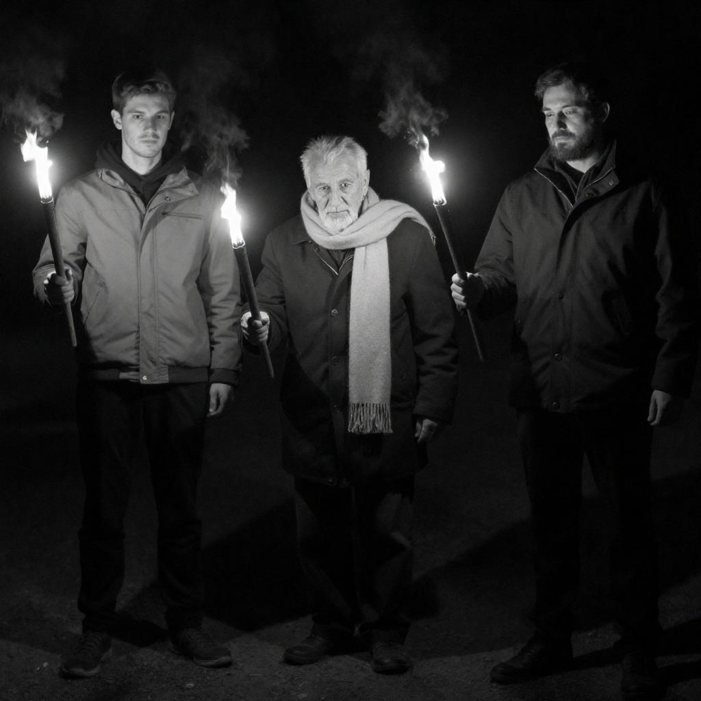 Black-and-white photograph of three men at night. Young man in light jacket and dark pants on left, elderly man in dark coat and white scarf in center, bearded man in dark coat on right. All hold lit torches, standing on dirt ground. Elderly man in center slightly hunched, intense expression. Torchlight illuminates their faces and immediate surroundings. Background is dark.