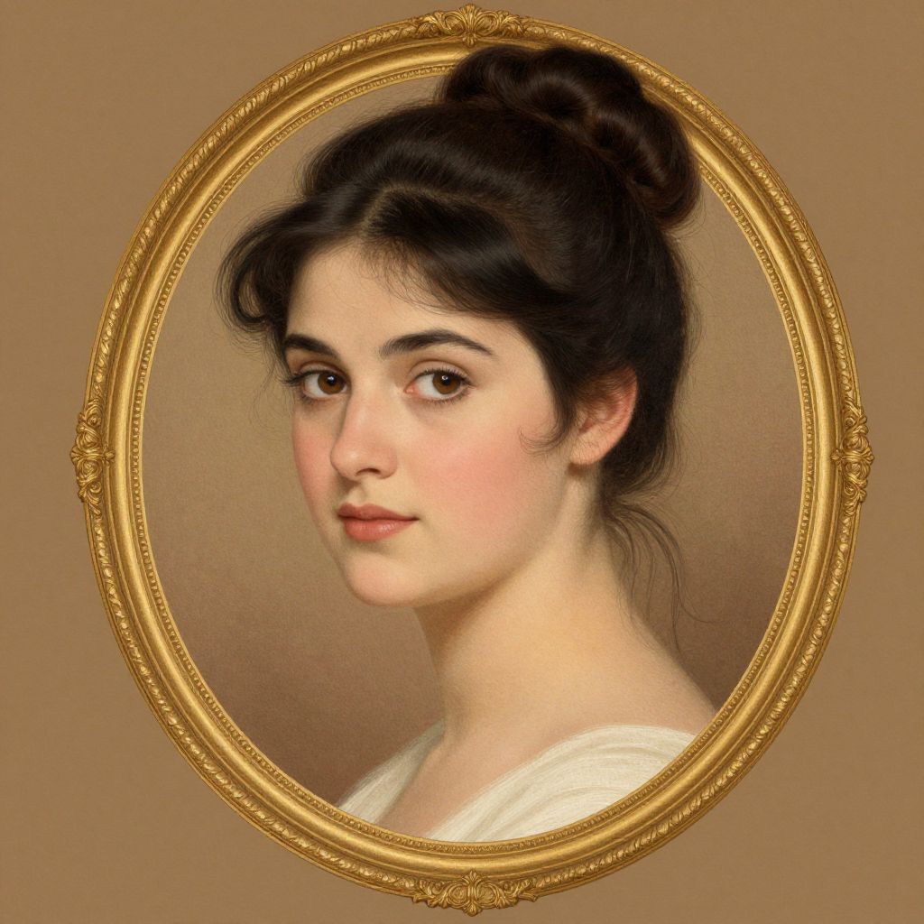 This digital artwork portrays a classical-style portrait of a young woman with fair skin, dark brown eyes, and slightly rosy cheeks. She has dark brown hair styled in an elegant updo with loose strands framing her face. She gazes softly at the viewer, wearing a white blouse with a dark brown shawl over her shoulders. The portrait is encircled by an ornate, golden oval frame with intricate detailing, set against a solid brown background. The overall style is reminiscent of 19th-century portraiture, emphasizing realism and gentle beauty.