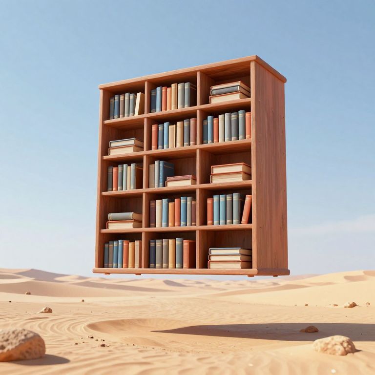 A surreal 3D-rendered scene depicts a floating library suspended above a desolate desert landscape, its shelves brimming with books in muted tones of orange, blue, and gray, evoking a sense of forgotten knowledge and nostalgia under the bright, clear sky.