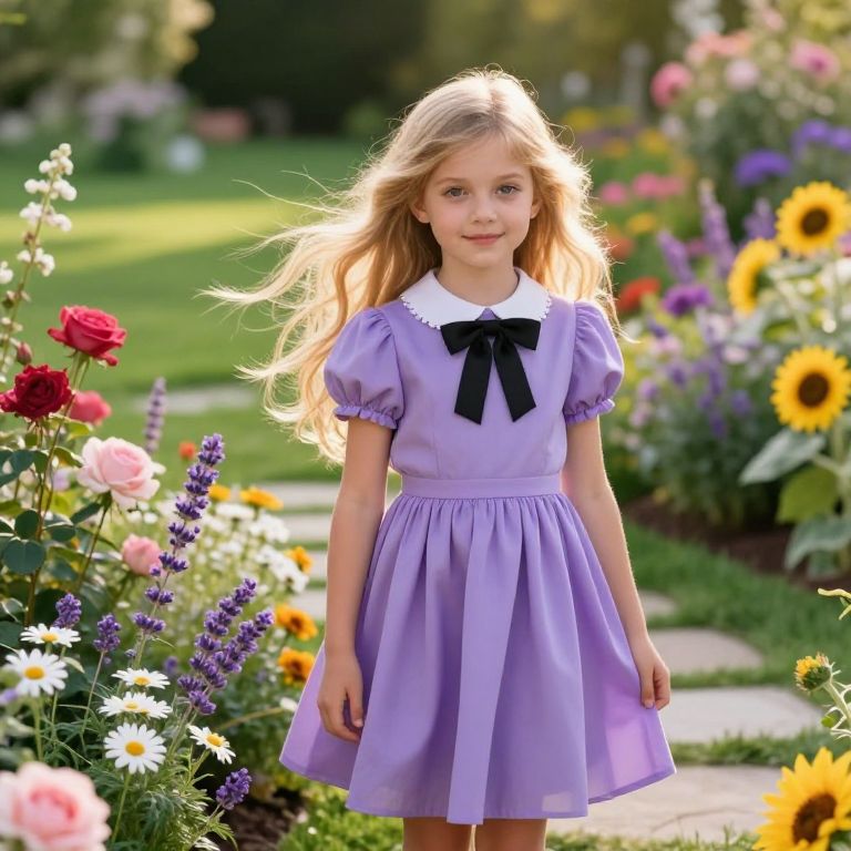 A beautiful young girl with long, flowing blonde hair, wearing a stylish purple dress featuring a delicate white collar and a bold black bow tie. She stands confidently in a vibrant garden filled with a variety of colorful flowers, including roses, daisies, lavender, and sunflowers, under a soft golden afternoon light. The scene is serene and inviting, with gentle breeze causing the flowers to sway and her hair to drift in the wind. The background includes lush green grass, a stone pathway, and a few blooming shrubs, creating a dreamy, natural atmosphere.