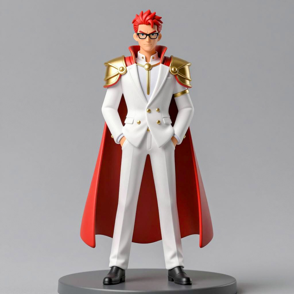 Male figurine with red hair, glasses, white suit, gold accents, red cape, gold shoulder armor, black shoes, hands in pockets. Standing on gray platform. Illustration style. Gray background. Intense, confident expression. Full-body view.