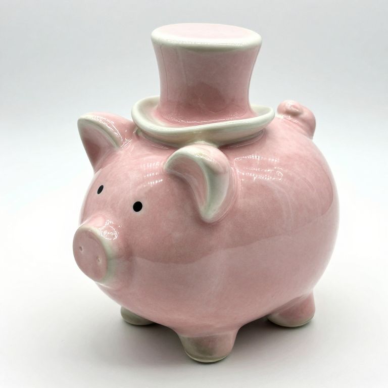 Photograph of a ceramic pink piggy bank with a glossy finish, featuring small black eyes and a rounded snout. The piggy bank has a slightly shiny, textured surface and stands on four short legs. It has a small, matching pink and white top hat perched on its head. The background is a clean, white gradient, highlighting the piggy bank's pastel pink color. The lighting creates subtle reflections on the pig's round body and the hat. The overall style is whimsical and playful.