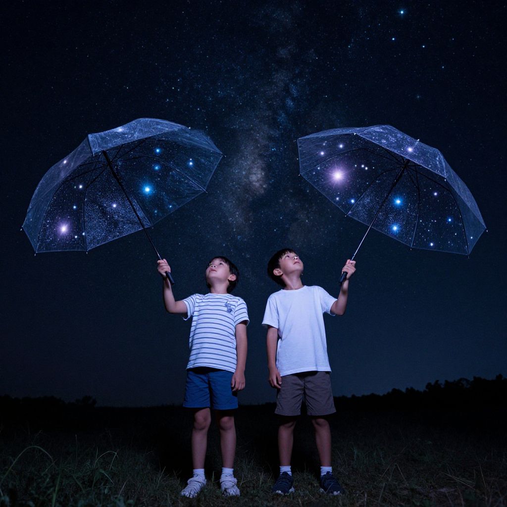 Photograph of two children under starry night sky, holding transparent umbrellas with glowing blue stars, looking up in awe.
