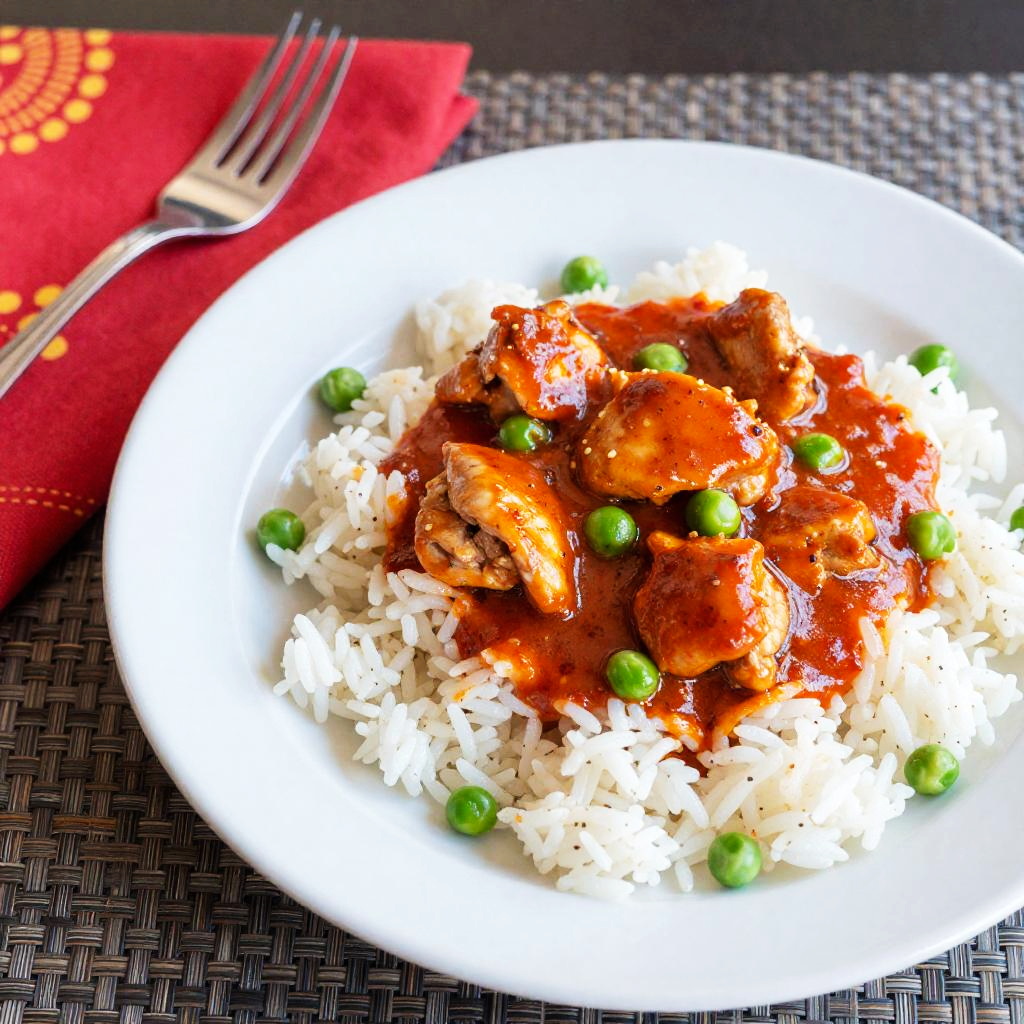 Photograph of a white plate with chicken in a rich red sauce, served over white rice with green peas. The plate is on a woven gray placemat, with a red napkin featuring yellow patterns and a silver fork on the left. The lighting is bright, making the colors pop. The image has a slightly over-saturated, vibrant look.