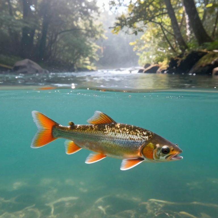 Fish gracefully swim upstream in a serene forested river, their vibrant orange fins contrasting against the tranquil turquoise water, as sunlight filters through the misty trees lining the banks.