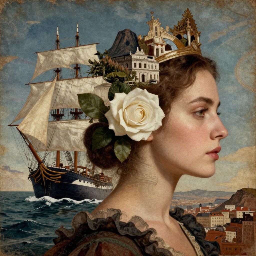 The image is a striking fine art collage featuring a woman's face as the central element, with various elements layered and integrated into her profile. The woman's face is adorned with a floral arrangement, including a prominent white rose, adding a touch of elegance and nature to her appearance. She wears a dark, ruffled garment that contrasts with the lighter tones of her face and the floral elements. Above her head, a crown-like structure is superimposed, blending architectural and natural motifs. The background is a rich tapestry of textures and colors, including a ship sailing on the ocean, mountains, and a cityscape, all contributing to a sense of depth and narrative. The ship, with its tall masts and sails, is positioned to the left, while the mountains and cityscape are integrated into the woman's profile, creating a dynamic and surreal composition. The overall effect is a harmonious blend of natural and man-made elements, evoking a sense of adventure, history, and the passage of time.