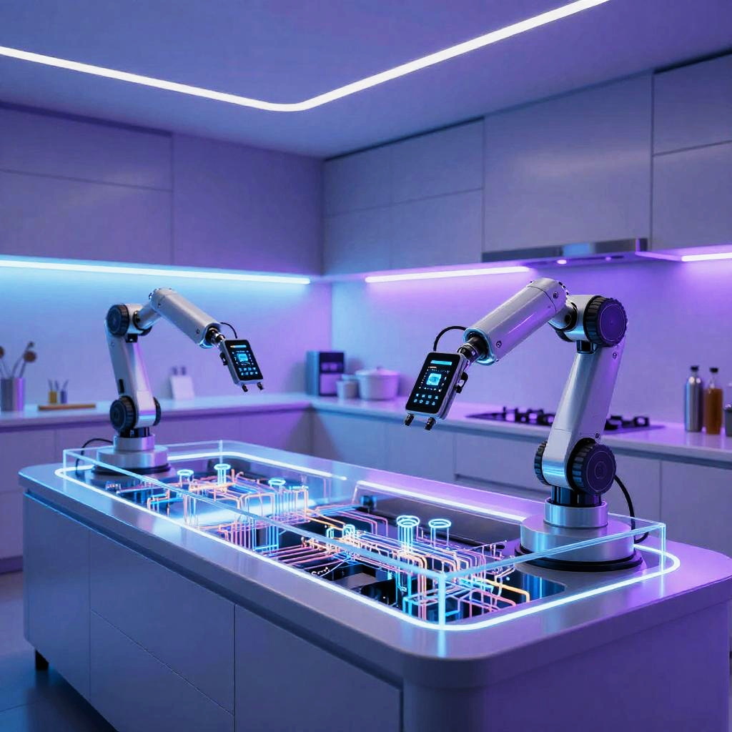 Sci fi kitchen featuring robotic chef arms, transparent countertops showing inner circuits, ambient blue and purple LED lights, minimalistic design with advanced technology touch panels