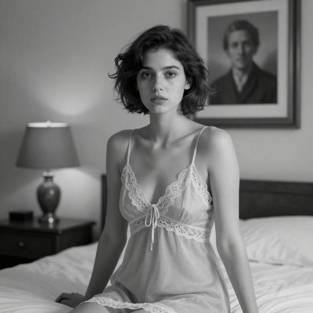 Black-and-white photograph of a woman with short, wavy hair standing in a dimly lit room. She wears a long, light-colored robe, holding a curtain to her side. The background includes dark wooden furniture and patterned curtains. Her expression is calm, and she stands slightly to the left of the frame.