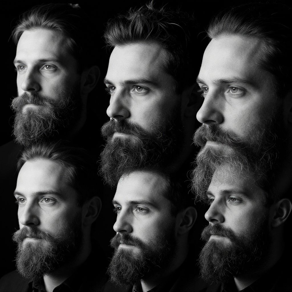 This is a black-and-white photograph featuring four identical close-up profiles of a bearded man with a serious expression, arranged in a 2x2 grid. The man has light skin, dark, thick, neatly groomed facial hair, and slightly wavy hair. His eyes are directed to the right, and his facial features are illuminated with a soft light, contrasting sharply against the dark background. The image has a high-contrast, almost surreal quality, emphasizing the texture of his beard and hair, as well as the depth of his gaze. The background is completely black, making the man's profiles the sole focus of the image.