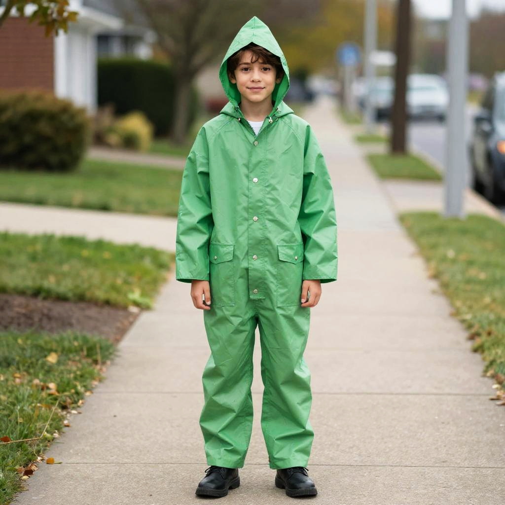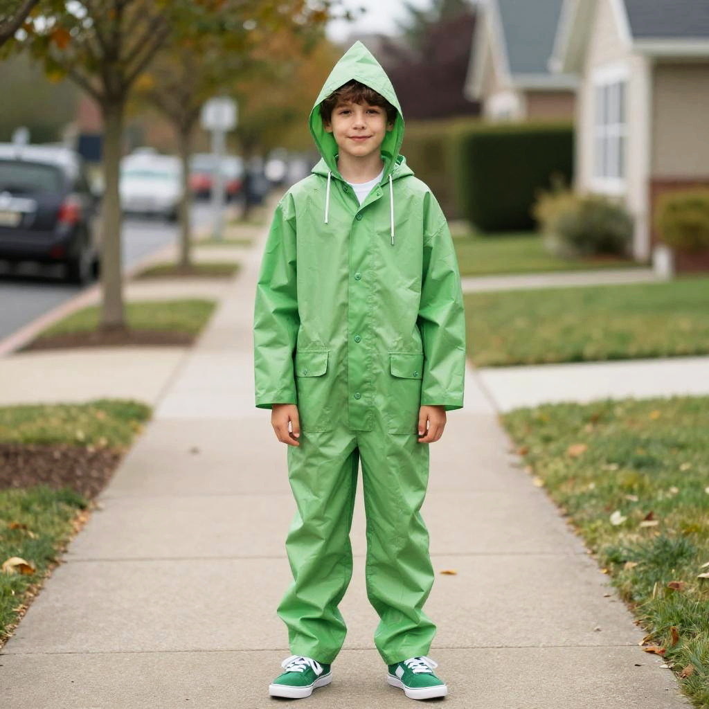 A young boy wearing a bright green rain suit with a hood stands on a suburban sidewalk. The rain suit is buttoned up, featuring pockets and a drawstring hood. He is wearing green and white sneakers. The background shows a residential neighborhood with trees and houses during autumn.