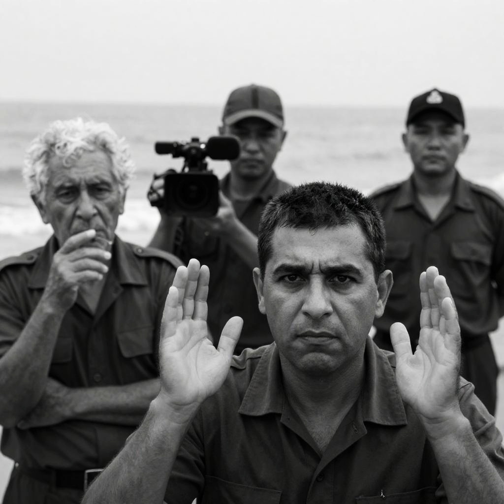 Black and white photograph of three men. Two men in the foreground, one wearing a hat, embracing each other emotionally. The third man in the background, in a uniform and cap, watching. Urban setting with buildings and street objects.