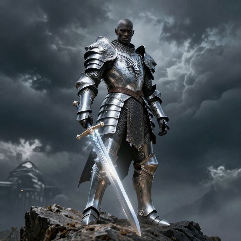 Digital artwork of a bald, armored knight with a glowing sword standing on a rocky cliff under a stormy, cloudy sky.