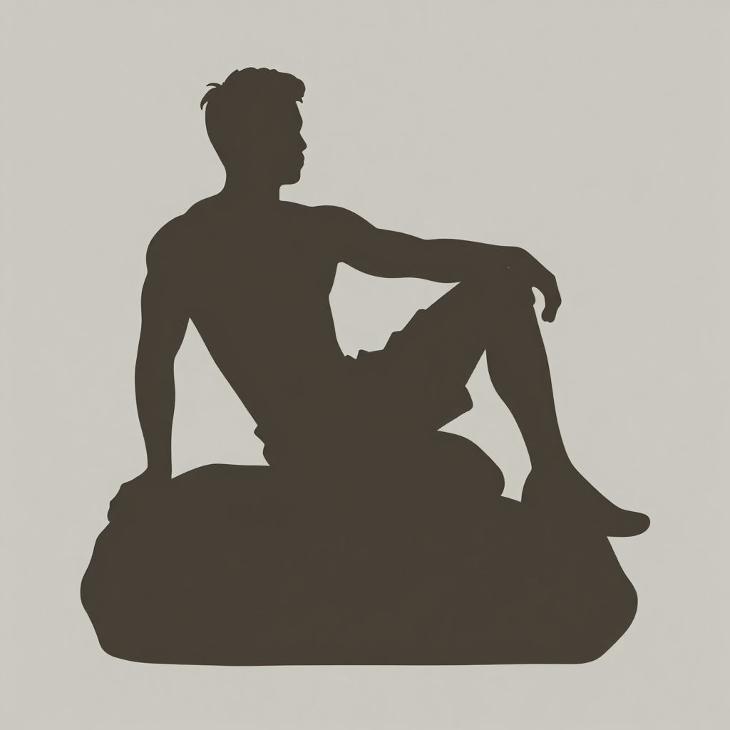 Silhouette of a muscular man with short hair, sitting casually on a rock, arm resting on knee, white background.