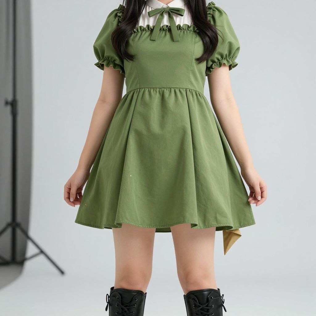 Noelle Elf Costume, a close up of a woman in a green dress and boots