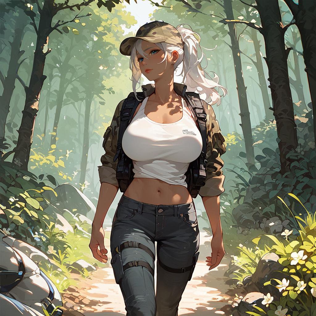 Score_9, score_8_up, score_7_up, score_6_up, source_anime, solo, 1girl, walking, tank top, large breast, camping backpack, jeans, forest, flower, sunlight, looking away, white hair, dark-skinned female, hair up, ponytail, camouflage, camouflage jacket, camouflage pants, camouflage headwear, open open jacket